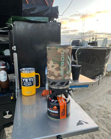 The kitchen is designed to mount to a flat floor that is in line with the bottom lip of the canopy door opening.